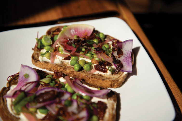 English Pea Tartine: English peas and citrus make a repeat appearance here in new ways. This open-faced sandwich features the diverse textures of fried speck, blanched green onions, citrus mascarpone, peas and shaved radishes on toasted rye.