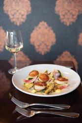 Diver Scallops: Perfectly seared scallops nestle on a pool of celery root puree in this savory dish. Students will learn how to blanch English peas to coax out the most vibrant flavor and color and make a citrus puree that brightens the whole meal.