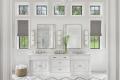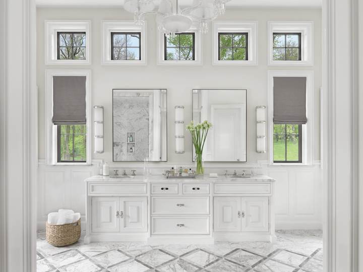 At approximately 420 square feet, the large master bathroom presented a challenge in working within such a large space. It was important to designers Accent on Cabinets and Slavin Construction to not just fill the space with wall-to-wall cabinets. The homeowners wanted a bathroom that gave them the feeling of being on vacation. Inspiration was taken from both New York City and Paris. The Baccarat chandelier is elegant and set the tone for the space. Marble flooring is intricately placed for a feeling of sophistication. The Waterworks tub is positioned to make you feel as though you are bathing on a private terrace. Custom cabinets were designed as furniture pieces and not just cabinetry. A subtle glaze on the cabinetry brings in warm tones to blend with the rest of the fixtures in the bath. As you enter the bath, the doors were designed to fold into the walls making them part of the woodwork when opened. No detail was left out in designing this magnificent master bath.