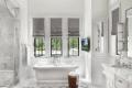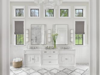 The tub area with the windows is absolutely gorgeous. The floor tile is amazing and well designed. We love the Parisian flair in this bath.