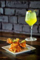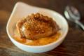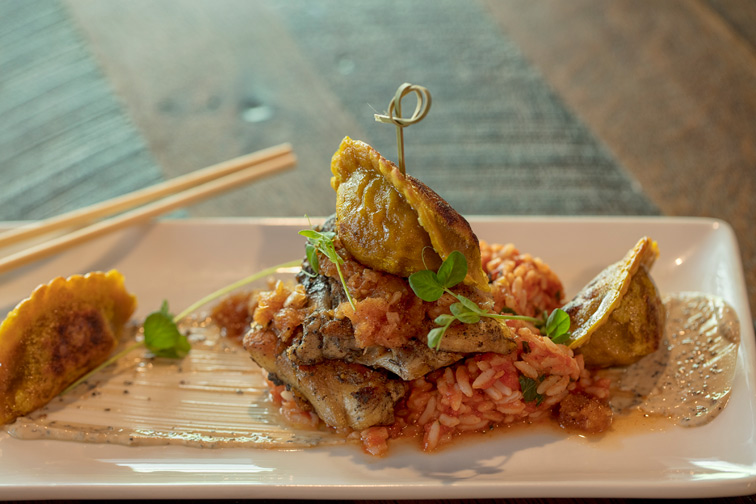 From the Coop: This hearty dish is anchored with a jerk-seasoned chicken thigh with a chorizo-date potsticker balanced on top and a generous serving of sofrito rice beneath. Grilled pineapple relish and lemon pepper cream finish the presentation.