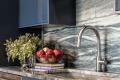 The sleek style of this kitchen fits perfectly with the loft look. The designer went big with the granite, which we love! The oversized island has plenty of room for both prep and entertaining.