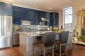 Sleek stone, rich wood and glass cabinets combine for just the right mix of contemporary design and subtle elegance in this 135-square-foot Clayton loft kitchen designed by Accent on Cabinets. The style and functionality are cutting-edge and inviting with a blend of modern and traditional design elements. Quarter-sawn oak cabinetry and contemporary blue glass cabinets mix for a look that is current and sleek but not sterile. The pop of blue is a fun twist from the all-white contemporary look often seen. The colors and movement in the granite countertops give the homeowner the feeling that she is sitting on the beach in the sand. Overall, the design in the loft is warm and welcoming, yet open and vast.