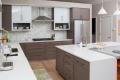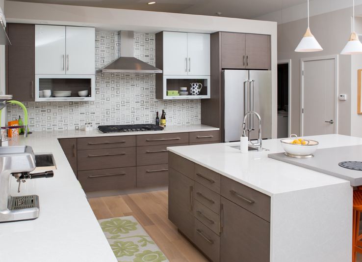 working closely with the owner architect of this new construction home, Gegg Design & Cabinetry made sure the kitchen would meet their request to simplify how they lived. The goal was to create a space that was functional and open with a modern feel. The cabinetry is horizontal-grain bamboo with a light-gray stained finish. The upper wall cabinets have glass-paneled doors that are painted white on the backside. The lower lift doors are only back painted on the perimeter to create an open glass cabinet. Stainless steel appliances complement the stainless-steel toe kick molding. The island features a full-size oven, small oven/microwave, prep sink and storage. The top is L-shaped with a waterfall on each end. The inside of the L features a slab of contrasting quartz counter that floats over the L-shaped portion of the island. The ceiling area slopes to an off-center ridge with a floating soffit over the cooktop. The cooktop wall does not go all the way to the ceiling to create an open feel to the office located directly behind the kitchen. Compact and fully functional, this kitchen has simple, clean lines and lots of natural light.
