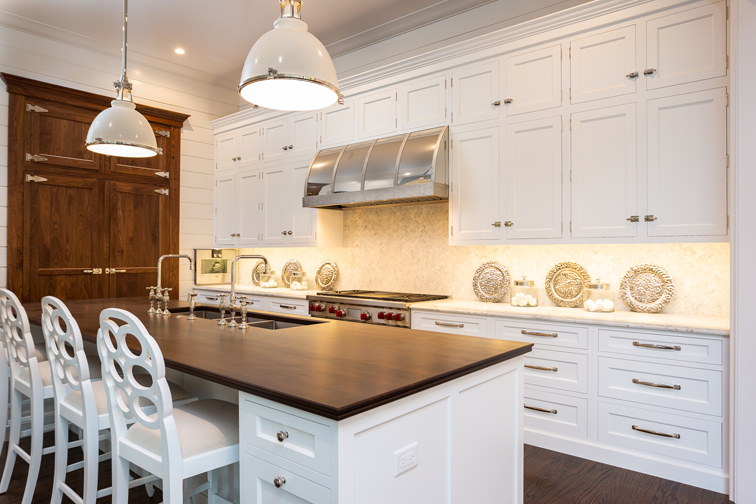 The kitchen in this new-construction home is inspired by a visit to the Hamptons with a little European-modern flair mixed in. Rooted in the classic Hamptons fashion with white, transitional-style cabinetry, designers Accent on Cabinets and Slavin Residential took the light, comfortable Hamptons kitchen and gave it warmth and drama with natural walnut accents. Shiplap was applied to the walls and simple moldings and crown were used to ensure the space keeps the Hamptons feel. White cabinets are accented by polished nickel elements. A custom walnut island is a must in the chef’s dream kitchen. The rich walnut wood covers the built-in refrigerator and freezer columns with icebox hardware for an extra touch. A hand-hammered, custom-polished nickel hood was added for a touch of shimmer and glam. A Carrara marble backsplash set in a herringbone pattern wraps the range wall. The airy elegance is continued in the breakfast nook, which is encased in windows and includes built-in seating. Additional utility hides behind the cabinetry with interior lighting, built-in outlets, charging stations, a dog-feeding area and plenty of drawers for convenience.
