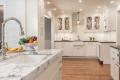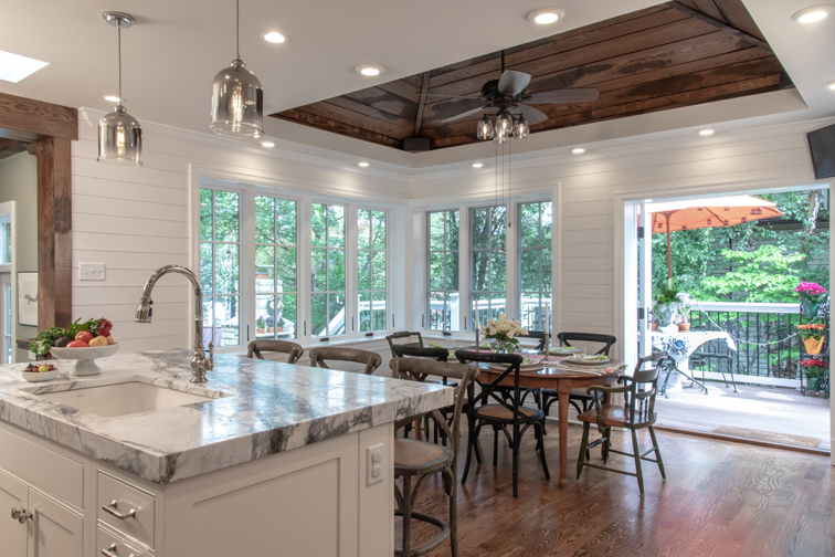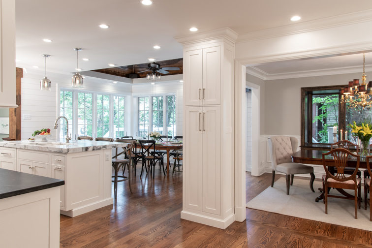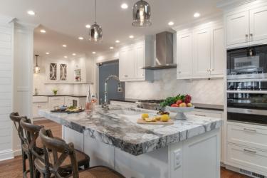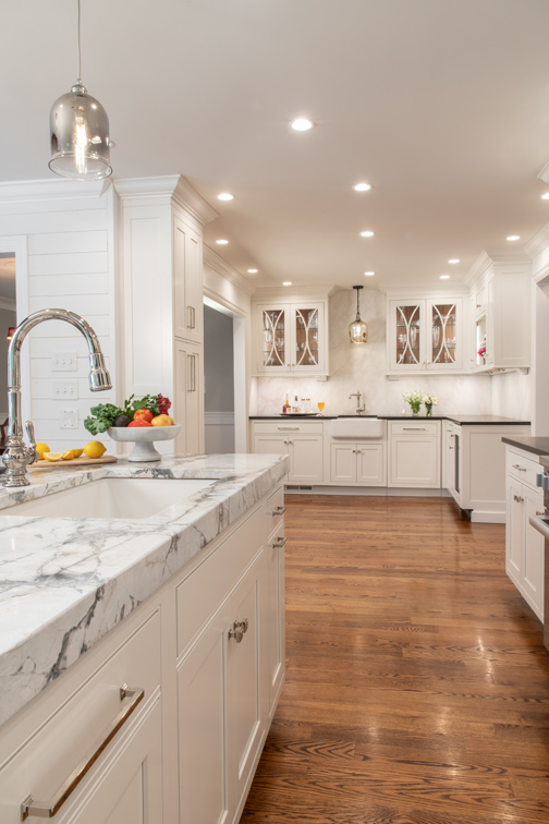This kitchen remodel held special meaning to designer Le Coeur Design as the homeowners were also her parents, and the kitchen remodel was in the home she grew up in. The goal of the project was to create a space that would function day-to-day and also provide the flexibility for the homeowners to host their immediate family of 11. Space was needed to make this renovation happen. The designer opened up the kitchen to the dining room and blew out the back of the house to extend the floor plan and give the space a united and flexible flow between kitchen, dining room, breakfast room and family room. Each cabinet was designed and specified to meet the clients’ needs. Aesthetically, the goal was to blend the traditional University City home with a modern and soft contemporary flair. The materials selected created a serene and light space. The backsplash is a full slab of Imperial Bianco honed marble. High-end appliances with a sleek and paneled look were chosen when possible. An additional Miele dishwasher and Sub-Zero beverage fridge in the bar were added to support larger family gatherings. Polished nickel accents were used to add elegance, warmth and shine. A modest-sized island was made more substantial by mitering the edge and creating a 3-inch countertop edge while also pulling the center of attention to the exquisite veining in the Sydney Blue suede marble.