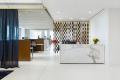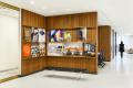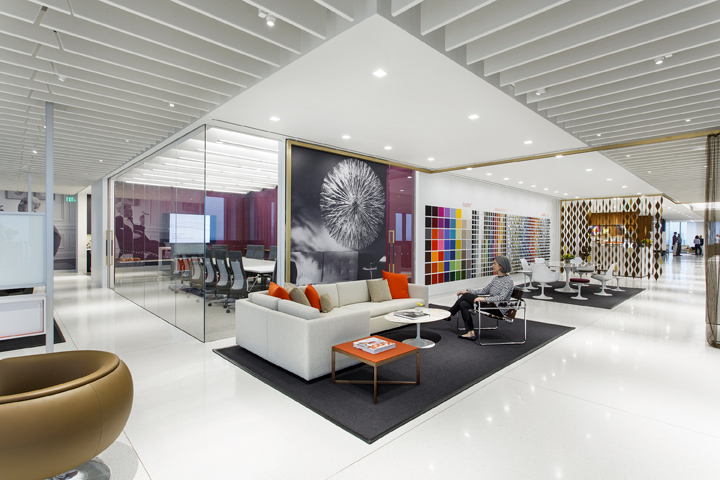 Knoll Incorporated is an American manufacturer of products for homes, offices and higher-education settings. Their new showroom and offices in Houston, Texas, are located on the ninth floor and roof terrace to give the space a gorgeous view of downtown. This 8,000-square-foot project led by ARO was designed to marry functionality and displays. The showroom contains open office areas of all sizes to show off the company’s office furniture and brand textiles. Though this showroom was designed to mirror those built in New York City and San Francisco, this location holds designs chosen for the Texas locale. One example is the sculptured brass rail that leads a customer through the changing selections they offer. Knoll’s products are actually used in the showroom as architectural pieces. A white textile made by Knoll covers the vaulted ceiling panels in entry area and main conference room, providing an acoustic cushion so the open showroom never gets too noisy. This bright white set next to a backdrop of custom leather on select walls provides an interesting and natural contrast as one strolls through the showroom. The floors are a stunning white terrazzo with brass dividers and the occasional brass Knoll logo. The showroom holds true to the brand’s colors as custom blue perforated leather door pulls cover brass doorknobs, tying into the color palette and adding an interesting and eye-catching detail to the already captivating space.