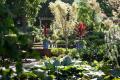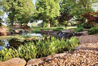 Rather than simply hiring a company and letting them create a water feature, the couple researched water gardens, bought tickets to the annual Pond-O-Rama, water garden tour sponsored by the St. Louis Water Garden Society and talked with the pond owners. The 2008 decision to build a water feature also led to a division of labor between husband and wife. The husband took over designing the ponds and stream. He contracted with Land Works, Inc., to create a waterfall flowing into a 100-foot by 8-foot meandering stream and a double-lobed pond. An arched bridge ties the two wings together.