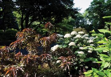 Deciduous trees: Japanese maples ‘Orangeola,’ small featuring cascading, lace-leaved foliage that is orange in spring, green in summer and red orange in fall (Acer palmatum) and Autumn Moon, also small with yellow to orange foliage in spring, turning chartreuse in summer and gold and red in fall (Acer shirasawanum); ginko Goldspire, columnar, small and dense with buttery yellow fall foliage, perfect for tight spaces; Coralburst crabapple (Malus coralcole), measuring 15-by-15 feet at maturity and featuring pink blossoms, deep green foliage and reddish orange fruit; Missouri native black gum (Nyssa sylvatica), a large tree with spreading horizontal branches and beautiful red fall color.