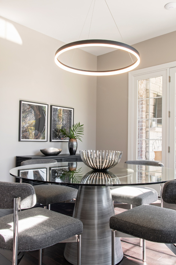 Airy and bright, the adjacent breakfast area introduces a curved motif with a round glass tabletop set on an ovate brushed chrome pedestal and a circular Sonneman lighting fixture. Against the wall, a slatted Nathan Yong credenza provides linear contrast.
