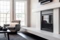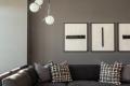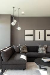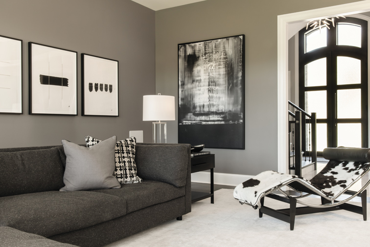 Off the foyer, richly hued gray walls create an intimate ambience for the great room, which features a Cambria quartz-faced fireplace, charcoal tweed Mitchell Gold + Bob Williams sectional, abstract and mixed media graphic artwork, and a round coffee table in grained American white oak with a black oak finish. Here, the statement piece is a mid-century Le Corbusier-style chaise in cowhide, commissioned by Knoll Furniture.