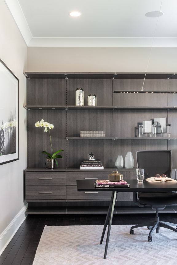 In the husband’s office, a “floating” Magis Baguette table from the Herman Miller collection serves as his desk. Reinforcing the linear theme is a chevron-patterned rug and a minimalist LED lighting fixture that resembles a circuit board. The dark grained cabinetry was custom-designed by California Closets, and softening the masculine effect is an oversize black-and-white landscape photo reminiscent of the owners' frequent trips to Colorado.