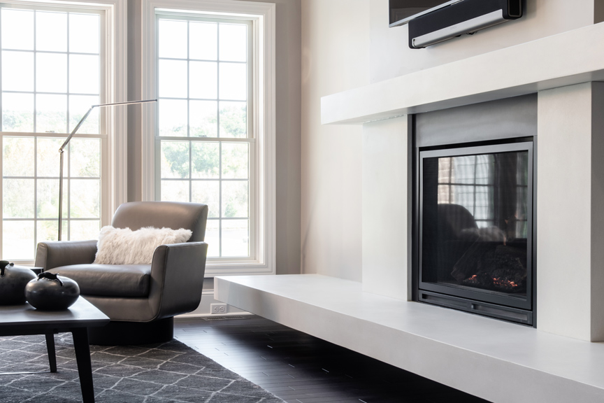 For visual interest, each space incorporates a carefully selected “statement piece.” In the view-packed, 2-story hearth room, for example, the focal point is a sleek floor-to-ceiling concrete fireplace with cantilevered hearth, custom fabricated by TruCrete. The sofa and leather swivel chair are set on a wool and bamboo silk rug from Restoration Hardware, and accented with chrome end tables and a concrete coffee table.