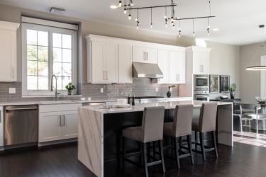 A 10-foot island, with gray-veined Cambria quartz waterfall top and dark base, defines the color scheme for the spacious kitchen. Overhead is an intriguing architectural Sonneman light fixture, and gray leather bar chairs are tucked under the overhang. The clean-lined white Shaker cabinetry by Midwest Kitchen & Bath is fitted with brushed nickel hardware, and the metal finish is repeated in the brushed stainless range hood and Thermador appliances, which include two dishwashers, refrigerator and warming drawers. To one side, a separate beverage center features darker cabinetry with wine cooler and coffeemaker.