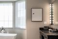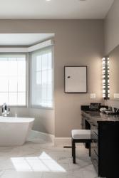 Similarly distinctive, the master bath’s freestanding Jacuzzi tub is set in a window-lit alcove; marble-grained porcelain tiles blanket the heated floors and glass-enclosed shower; and the bold black cabinetry is surfaced with veined black Cambria quartz.