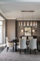 Lit by a linear candle chandelier evocative of Beaux Arts styling, the dining room showcases an array of Mitchell Gold + Bob Williams furnishings and the designers’ subtle use of texture. The live-edge rosewood table is surrounded by contoured dining chairs upholstered in velvety suede-like fabric. Rattan accents the rosewood buffet doors, and the area rug has a tactile striae pattern.