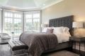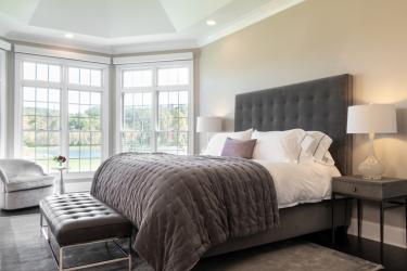 A subtle shift to taupe-y gray walls establishes a warm ambience for the luxurious main-floor master retreat, which is enhanced by a vaulted ceiling and offers spectacular views of the lake. The plush velvet headboard and bedding are contrasted with a leather and chrome bench, bed chests with a textured shagreen finish, and a slight metallic sheen in the area rug. The attention-getter in this contemporary-yet-cozy haven, however, is its raised horizontal electric fireplace.