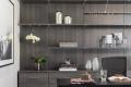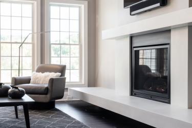 Flowing effortlessly from one to another, the large, open interior spaces provided the designers with essentially a blank canvas. “We wanted the décor to be calm, sleek and balanced, with the right amount of restraint — not busy or overdone,” Meghan explains. As a result, they chose a monochromatic palette, with charcoal-stained, wide-plank maple flooring throughout the main level; warm gray walls; clean-lined trim work; and fully automated window treatments from Waldbrandt Technologies that allow for privacy while emphasizing the beautiful lake views and transforming the space into a fully automated home.