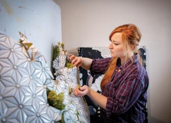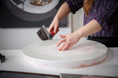 Gillen begins her work by considering the material she will be using that day. Because each work of art is so different, her process is always changing and evolving. The materials she uses for sculptures and installations are those we find in our own homes, such as sheetrock, various tiles and wallpaper. By using these everyday items, she hopes to create conversations not only about the artwork but about the unique relationship everyone has with the notion of home.
