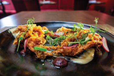 The creative plating of Grand Tavern takes place on the ground floor of the Angad Arts Hotel in Grand Center, a fitting locale for food with a flair for the dramatic arts. Hotel guests can select bold-hued rooms to suit their moods – Passion Red or Tranquility Blue, for example – and many items on the restaurant menu echo the theme. There, Robert’s take on “angry lobster” is a bit less spicy and goes by the name of Emotional Lobster Dumplings. (For diners feeling more hot around the collar than weepy, there is Angry Broccoli.)