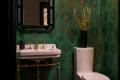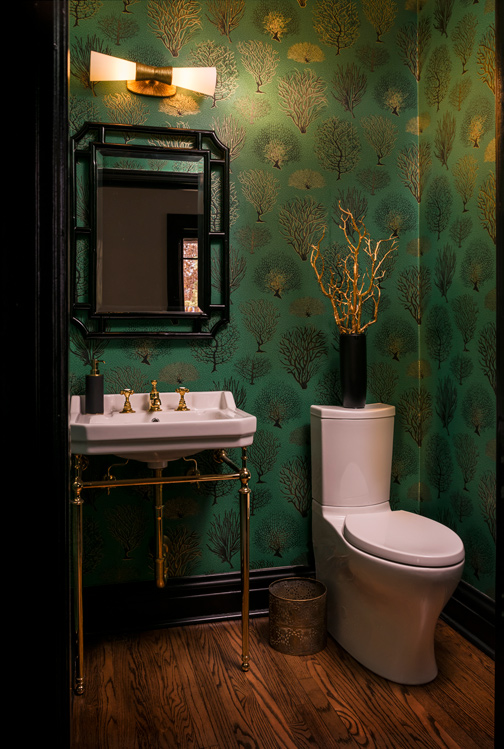 The lack of a powder room on the first floor prompted this bathroom design by Marcia Moore Design. What was once a coat closet became the spot for the new powder room. At only 24 inches deep, the designer also stole some space from the large front entry to allow for a small-scale toilet and vanity in the new powder room. A pocket door was added to enhance the usability of the space. The homeowner loves saturated color and bold design and was not afraid to take a risk on the daring Cole & Son wallpaper. The console sink with brass stand and exposed plumbing is appropriate for the time period of the home, which was built in the 1920s. The Waterworks faucet also honors the aesthetic. The ribbed texture in the Visual Comfort light fixtures complements the coral design on the wallpaper. The mirror was painted black to match the wallpaper and baseboards for an overall cohesive design.