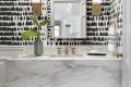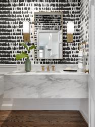 Inspired by Schumacher’s Queen of Spain wallpaper, which was introduced in 1963 when it was featured in an iconic black-and-white photo of Mick Jagger, Castle Design created a hip-traditional powder room for their clients. The designer created a scheme that blended traditional elements found in the home with modern details to create a space fit for the trendsetting wallcovering the homeowners requested. Brass elements, such as the angular sconces and delicate framed mirror, pop against the organically patterned wallpaper. The Kohler Purist faucet is a modern twist on a vintage cross-handle design. The room’s petite footprint of only four feet was a challenge, but the designer embraced the small square footage by designing tailored elements like the custom-made floating vanity to fit perfectly into the floor plan. The homeowners have three young children, so functionality was also key. Castle Design incorporated a vanity backsplash and solid wood chair rail with panel molding to ensure durability and easy cleanup. This small space is now elevated with style and a little rockstar swagger.