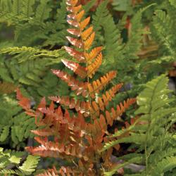 Our favorite fern is the Dryopteris eryrhrosora “Brilliance,” which is known for bringing multi-season garden interest. Pink fiddleheads unfurl to reveal beautiful, coppery fronds that will then develop into a dark glossy green and remain well into winter. This plant will provide a colorful tapestry to enjoy from spring through fall. Sarah Riley, Bowood Farms.
