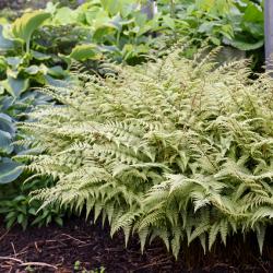 A fantastic hybrid cross between Japanese Painted Fern and Lady Fern “Ghost” brings stunning frosted apple green fronds that seem to glow ghostly white light in the shade. Its dark purple stems hold the broad fronds rigidly upright. It’s easy to grow in shade, even in the tough situation of dry shade. Ann Lapides, Sugar Creek Gardens.