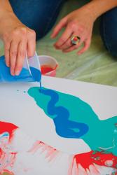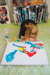 The results are abstract and stunning with saturated colors and bold clusters of shapes. Coyle goes on to explain, “They take on a cellular look; like looking through a microscope. A lot of people may not even decipher what the painting is, but with my experience I know it's carcinoma or an infection. I really like boiling it down to the essential parts and telling a story through that.”