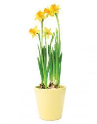 Daffodil “Tete a Tete” also known as Narcissus cyclamineus | Information provided by Jim Oldani at Timberwinds Nursery: A shallow pot with drainage hole is ideal for forcing these wonderful, small daffodils. Fill with 2 inches of potting soil and add some bulb food. Position bulbs close together but not touching and cover with potting mix so that bulbs are about half an inch below the pot rim. Gently firm soil around bulbs and water well. Cover pot with newspaper and place in a dark location at 30 to 50 degrees for about 12 weeks, check soil periodically and water as needed. Shoots should be three to four inches tall before moving into the light. To force the flower, place the pot in indirect light at about 60 to 65 degrees for three to four days, then place it in full sun until blossoms open in approximately three to five weeks. Make sure to keep the soil moist! After about 16 to 17 weeks after planting, these 7-inch tall daffodils will sport a bright yellow flower. Tete a Tete is great for its compact size, profuse flower and bright yellow color; it’s also great for both forcing and displaying in a garden bed, not to mention it’s a cheery addition to any window sill!