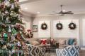 Adjacent the fireplace wall and bridging the gap between the family room and dining room, Laurie’s tree is filled with Christopher Radko ornaments that she has loved forever. “Since they were born, I buy my children each one every year to open on Christmas Eve,” she says. The delicate ornaments bring bright pops of color to her greenery that is swagged in a simple, silver trim.