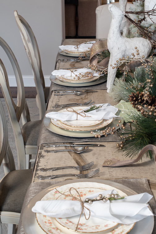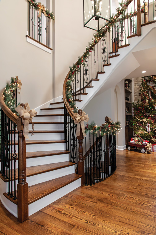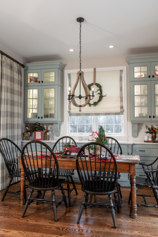 For the family’s holiday décor, Maria hoped to create a warm, welcoming ambience with a traditional red and green color palette, fresh greenery, well-worn antique pieces and meaningful objects collected over time. They started by decorating a special tree with handmade ornaments that her mom made for the kids every year. For heartfelt accents, they included an old wagon and rocking horse from Maria’s childhood as well as using heirloom dishes from her grandmother and great-grandmother to arrange a beautiful dining room table setting. These elements work perfectly with the architecture of the home, Bill Cover adds, elevating the home’s style to a new level during the holiday season. “The exterior of the home is reminiscent of an English cottage, so it’s styled perfectly for decorating during the holidays!”