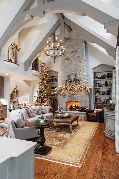 Poised within a posh St. Charles County neighborhood offering magnificent views of Chesterfield Valley, J.T. and Maria Norville’s spectacular French Country-style home emanates quaint rustic charm and classic timeless style. Awash in tranquil shades of blue splashed with vibrant pops of color, their newly built home emits an inviting air of coziness especially during the holidays.