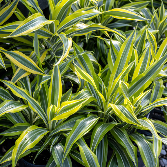 Bring the tropics to your home with “Lemon Lime” dracaena. An exotic looking wonder, it features long green leaves highlighted with yellow and white. An added bonus “Lemon Lime” is an efficient air filter, removing harmful chemicals from the air. When young the plant is small and it looks like a small bush. Over time it will grow into a small tree with a woody stem. It works fantastic as a houseplant indoors or outdoors as a stand-alone specimen, or it can be added to mixed seasonal containers. Easy to grow, it tolerates low light but also does well in bright, indirect light. Information provided by Ann Lapides at Sugar Creek Gardens.