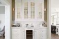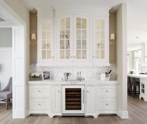 2. Classic Cabinetry, by Schwarz Lewis Design Group. This butler’s pantry is an example of a classic, medium-tone wood floor, home bar design in Chicago. The space features glass-front cabinets, white cabinets, multicolored backsplash and white countertops. There is no sink. The wall color is Smoke Embers by Benjamin Moore.