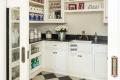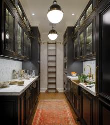 3. Black-and-White Beauty, by Martha O’Hara Interiors. This tucked away pantry and prep space is located between a mudroom and kitchen—the perfect place for dropping off groceries or making popcorn. Designer Elizabeth Darth of Martha O’Hara Interiors chose seeded glass pocket doors to allow natural light into the room and obscure messes from the outside.