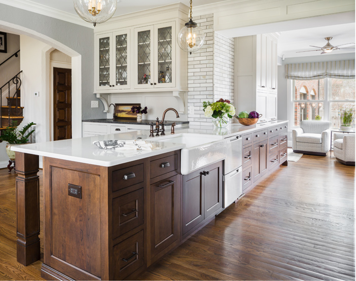When previous owners had updated the home in a way that didn’t function well, the homeowners called on Karr Bick Kitchen + Bath to make the outdated and choppy kitchen into a new space perfect for entertaining family and friends. The designer’s challenge was to conceptualize a creative plan that connected the spaces and tied in a galley kitchen design—a favorite of the homeowners. To achieve a more connected layout, walls were taken away and a wide, arched opening was added. The designer chose finishes to reflect the historic charm of the 100-year-old home, such as the custom diamond Tudor window leaded glass panels in the bar. The finishes also marry the taste of the husband and wife, who both played integral roles in making design decisions with their designer. The white quartz countertops and the light-glazed varied brick backsplash coupled with the rich cherry wood cabinet finish and light gray painted cabinets add a transitional feel in the kitchen. The custom cabinet design is specifically tailored to every inch of the kitchen and provides ample storage. The range hood design is a statement piece that distinctly crowns the kitchen. The resulting space now flows perfectly with the rest of the home and has made entertaining family and friends a dream come true.