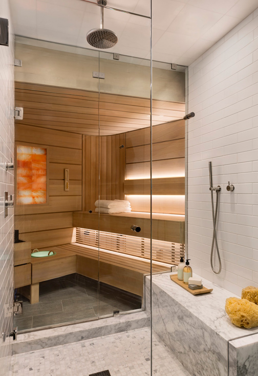3. All About the Bench. By Forum Phi Architecture. A custom-crafted sauna was designed for a luxurious residence in the heart of Aspen, Colorado. The final design resulted in unique bench configurations, glass doors and accented wood features inside and out.
