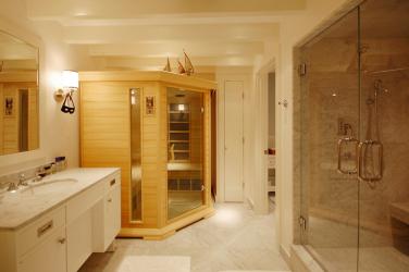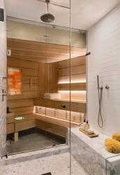 5. Custom Cedar. By Lee & Co. Contractors. This custom cedar sauna in a redesigned master bathroom was created by Mark Reilly Architecture. The design of the bathroom flows seamlessly from tub, shower to sauna.