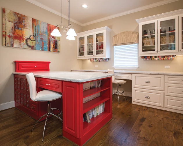 3. For the Lady of the House. By Duckworth Interiors. This multi-functional space was created to be the laundry room and craft room for the lady of the house. One of the doors connects to her husband’s study, which was a great solution for them to be near each other in the evenings while still working on their own. The base of the island was made from vintage library card catalogs to house small craft items and was painted red. We incorporated etched glass to spell “Create” in the upper cabinets. Below the uppers, you’ll notice rods to hold all of her ribbons and trims.