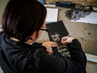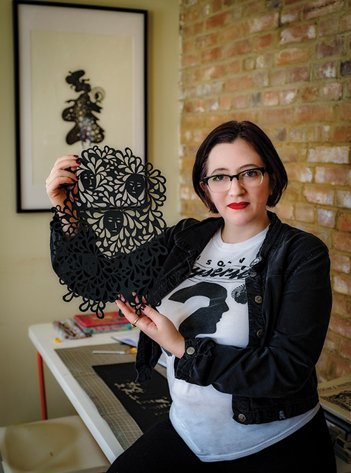 Adrian has shown her work at many different venues throughout the St. Louis area including Art Saint Louis and the Cherokee Street Art Gallery. Last winter, she produced her very first enamel lapel pin based on one of her paper cuts. She also recently joined MADE, a maker space in the Delmar Maker District, and learned how to use their laser cutter. Her next big project is going to be using these tools to transfer her designs to other materials such as acrylics.