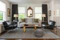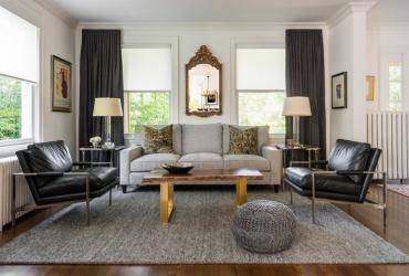 The couple repurposed materials any way they could and used the original doors and crystal door hardware. For the sitting room, they created a custom walnut radiator cover and display case that incorporates the glass from the original cabinetry in the home. Karen accented the space with an original Wishbone chair by Hans Wegner that creates a clever juxtaposition between classic and modern. The living room’s sleek Thayer Coggin Milo Baughman chairs paired with an ornate antique mirror generates the same wonderful contrast between old and new, and the original hearth was given a contemporary edge with eye-catching green tiles from Waterworks.