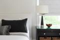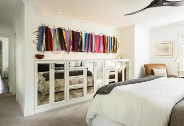The couple’s successful solution included choosing an all-white palette that not only created continuity but also infused the spaces with a pared-down sense of serenity. An inviting white soaking tub from Immerse is complemented with white subway wall tile and lustrous marble herringbone-patterned floor tile. The master bedroom’s tranquil white vibe offers the perfect backdrop for a vibrant and dramatic wall hanging created by Brother Mel, an iconic local figure whose works can be seen all over St. Louis and around the world.