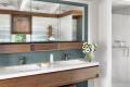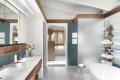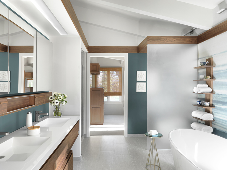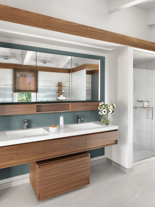 Why the judges love it: This spa-like bath is so sophisticated with the use of angled beams and stained walnut. We love how clean and streamlined the look is while the colors and textures add interest.