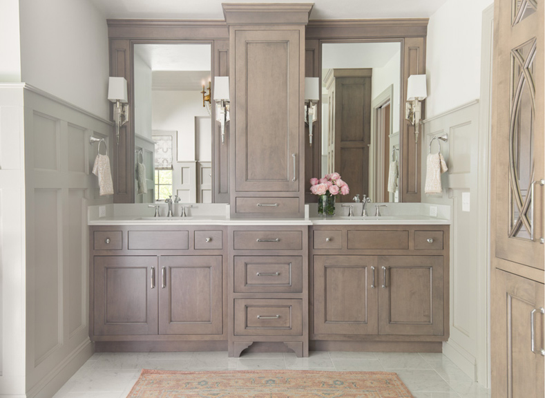 Karr Bick Kitchen & Bath created a stylish and soothing sanctuary for these homeowners. The layout for this new bathroom was hard for the homeowners to visualize because of the tall cathedral ceiling, which required that the toilet room ceiling would need to partially float in the space. To perfectly balance the space, the floating room mimics the same size as a tall vanity cabinet which flanks the door opening. Decorative mullion mirrors on the tall vanity reflect light and open up the space. Light wood stained cabinets have an airy note with slender silhouettes and glass and mirrored designs incorporated within. The designer combined the smooth wood tones with rich marble tiles in the wainscoting woodwork, trim and paint colors. An unexpected touch is the painted woodwork ceiling, which adds dimensions to the space. The crown molding was matched for both tall columns. To enrich the look and feel of a retreat, the designer chose gorgeous accents like the glimmering polished nickel sconces, gilded gold chandelier and beautiful Schumacher fabric Roman window shades. The resulting master bath has a lived-in feel while at the same time being luxurious.