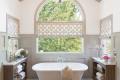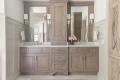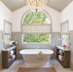 Why the judges love it: This master bath is elegant and liveable. We love the detailed ceiling and window treatments. The stain on the cabinetry gives the room a simple elegance.