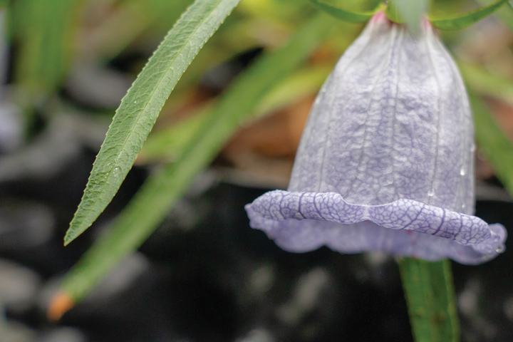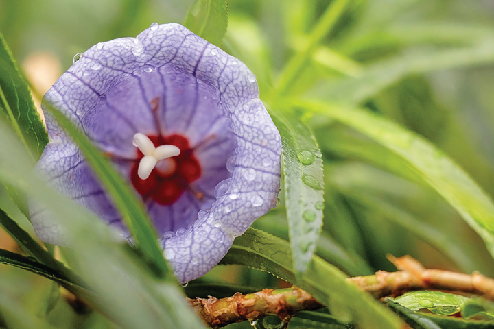 Tucked among wild vines and blooming orchids that fill the Climatron is a pale indigo bell-shaped flower with dark purple veins and bright red nectar. The Nesocodon mauritianus, or Mauritian Bloody Bellflower, is endemic to the Indian Ocean island of Mauritius, where it grows on cliffs near waterfalls. The plant is thought to be pollinated by geckos.