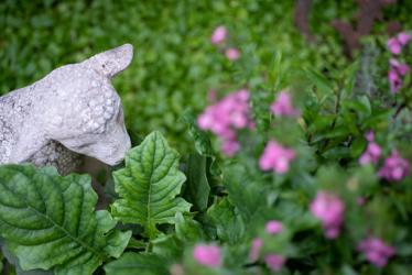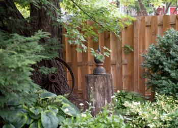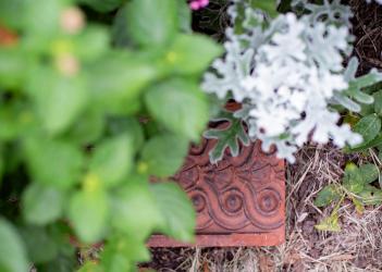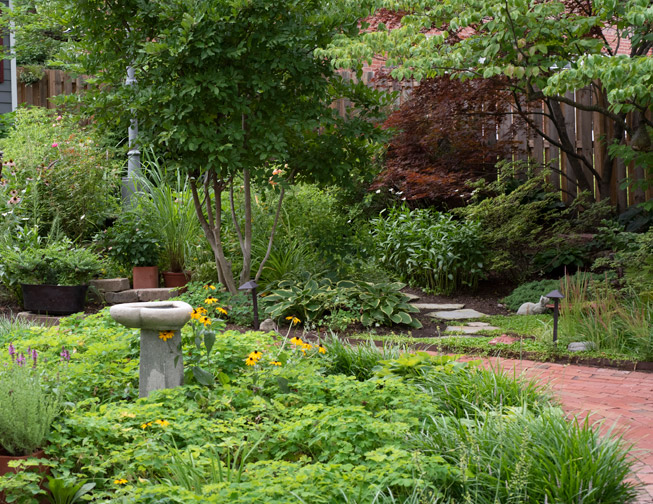 Barbara and Neil Finbloom’s Kirkwood garden is a showcase of fragrant herbs, lush perennials, ornamental trees, charming structures and whimsical artifacts. Though compact in size, it overflows with spaces to explore and delights to discover. Artfully designed brick walkways beg to be traveled and stepping stones nestled in a bright green, ground-cover carpet of miniature-leafed mazus beckon to be followed.