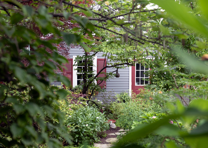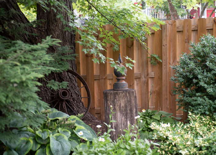 The couple also lost a large oak tree a few years ago. In that spot, now stands one of the decorative highlights of the garden, a large, hand-crafted replica of their Colonial-style home designed for garden birds and created by Neil as a Christmas gift for Barb. As luck, and an eye for antiques would have it, the bird house now rests atop a Victorian porch post the couple had previously purchased at a farm auction, having no idea how it would eventually be used.