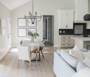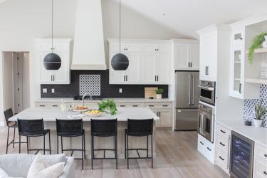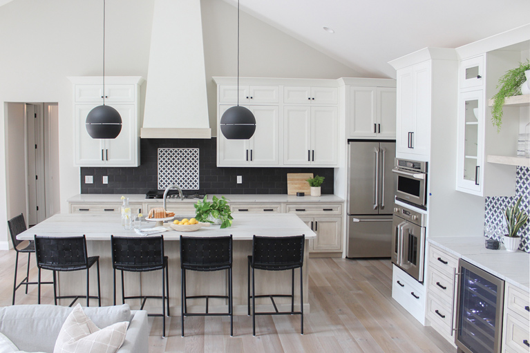 This stunning kitchen designed by Stephanie Pohlman blends modern and classic elements to make a bold statement. The goal for the project was to keep the design very bright and clean, so Pohlman chose a soft white finish for the upper cabinets. To create a contrast as well as the unique look her client was looking for, she chose a matte black subway tile backsplash with a black-and-white mosaic to accent. The accent tile is repeated in the beverage area under floating shelves. Both designer and homeowner fell in love with the natural wood stain on the lower cabinets and island. With large vaulted ceilings, the hood became a focal point in the large, open area. Framing and drywall, which tapers to the ceiling, achieve the dramatic height. The bottom of the hood is accented with the same stain as the island to pull the look together. Modern pendant lights flank the hood, drawing your eye up and around the kitchen. Classic elements like polished nickel fixtures, inset-style drawers and matte black hardware combine with the modern touches in the kitchen design.